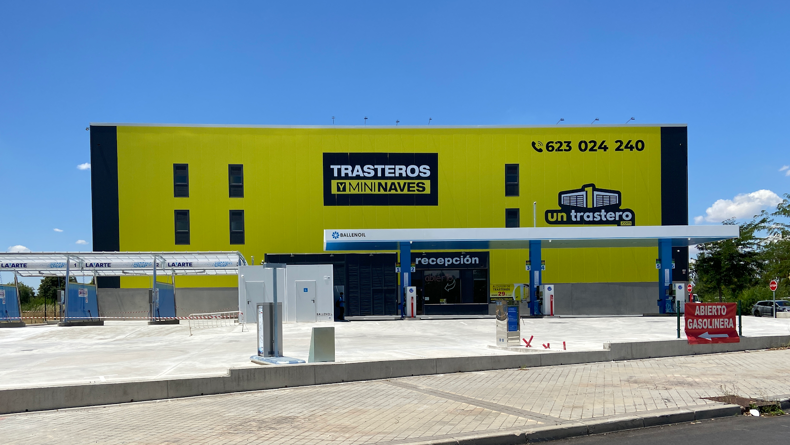 Storemore Smart Self-Storage en Fuenlabrada. Trasteros inteligentes con acceso mediante app digital, tamaños desde 1m² hasta 20m²+, acceso 365 días (06:00-24:00), videovigilancia 24h, puntos de carga EV gratuitos, 70% autoconsumo solar. Servicios de mudanzas y coworking disponibles.